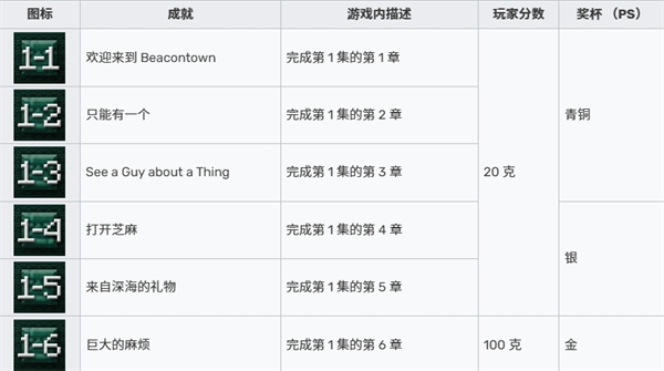 故事模式 - 第二季有 30 项成就(PlayStation 上有 31 项),在 Xbox 和 Windows (Microsoft Store) 上价值 1,000 玩家分数。