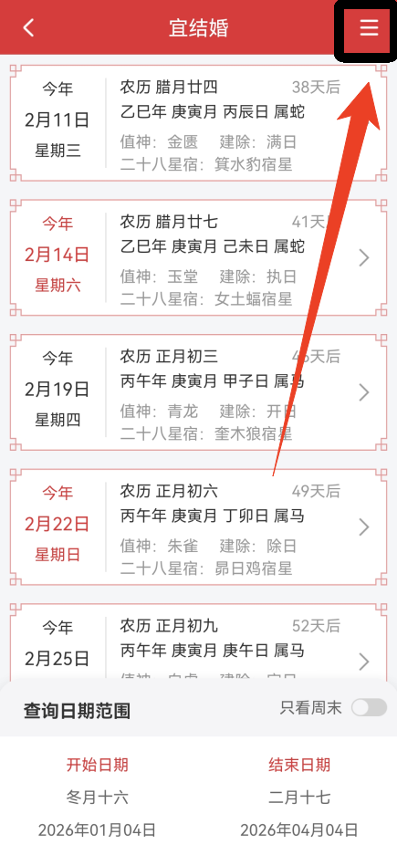 6、如果你想挑选其他的吉日,点击右上角三条横线的选项。