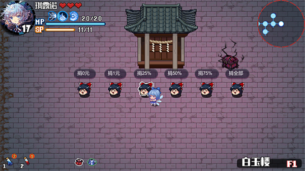 战斗系统丰富多样,包括普攻、DASH和多种技能类型。每个角色的DASH都有特殊效果,比如琪露诺能冻结敌人,妖梦则能对触碰的敌人造成伤害。迷宫中还有解谜房间、商店房间等特色区域,增加探索乐趣。游戏支持收集角色、服装、音乐和写真等多种内容,满足玩家的收集欲望。