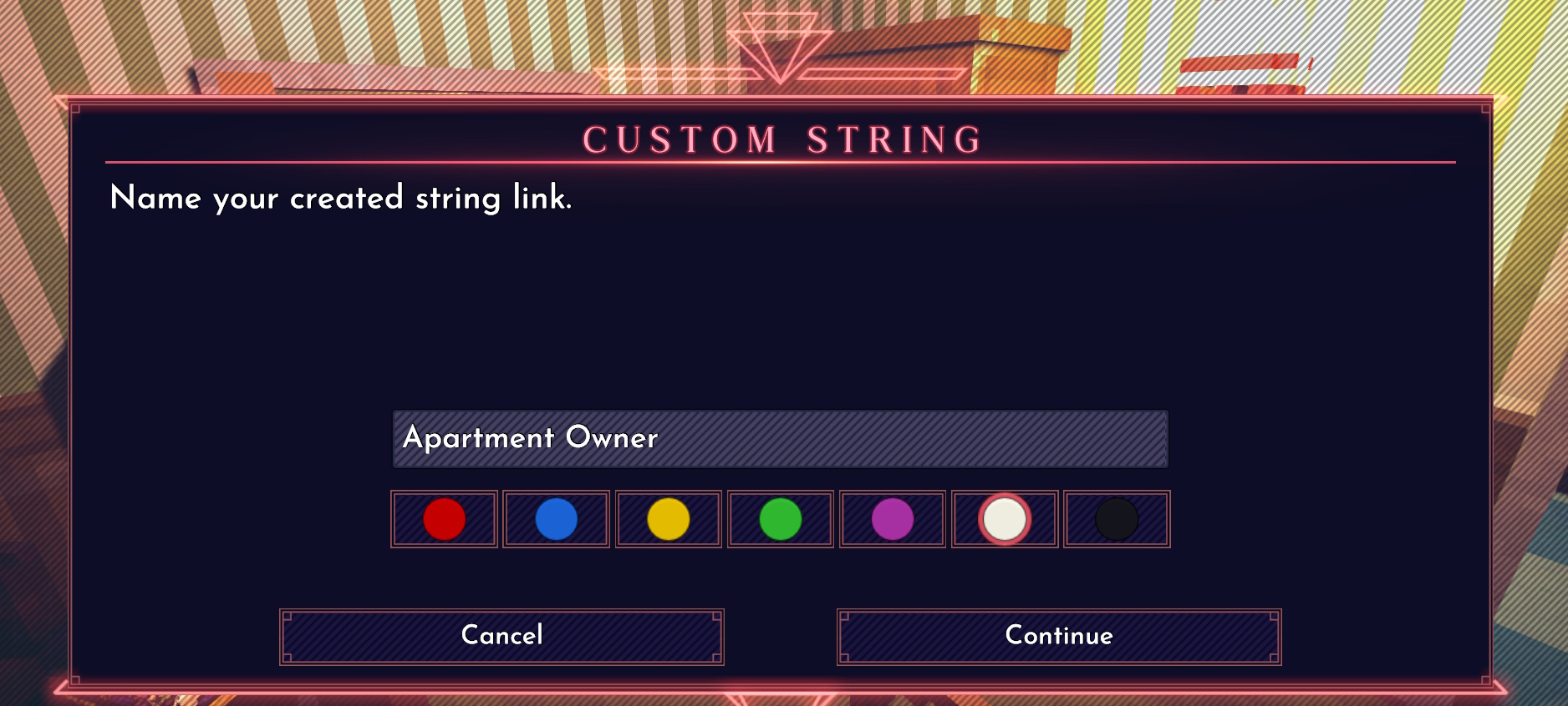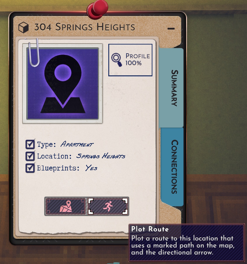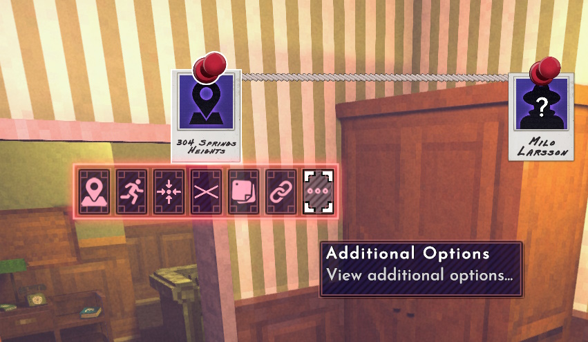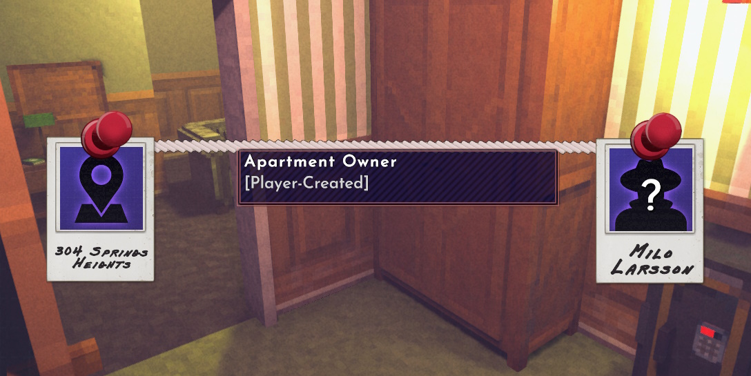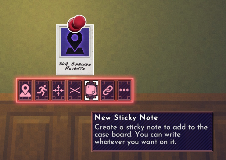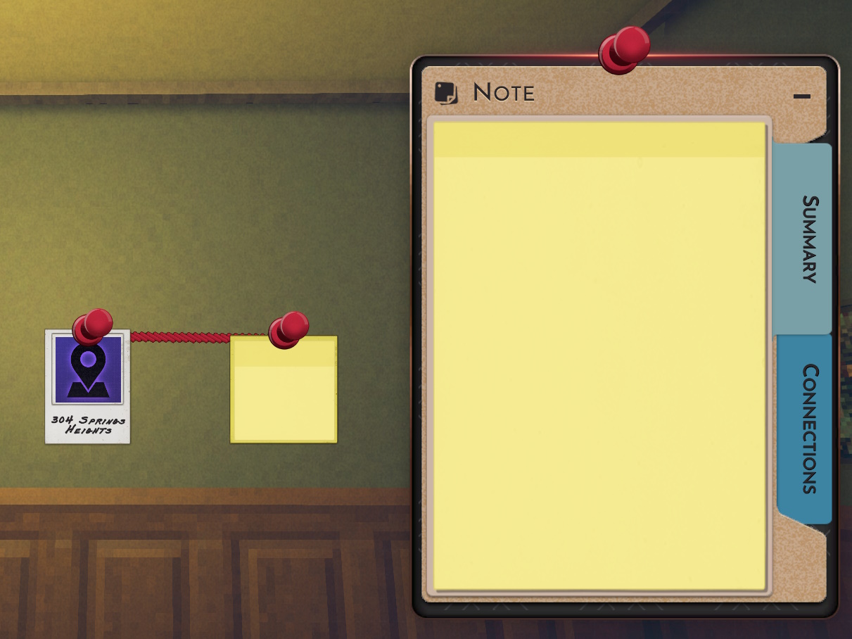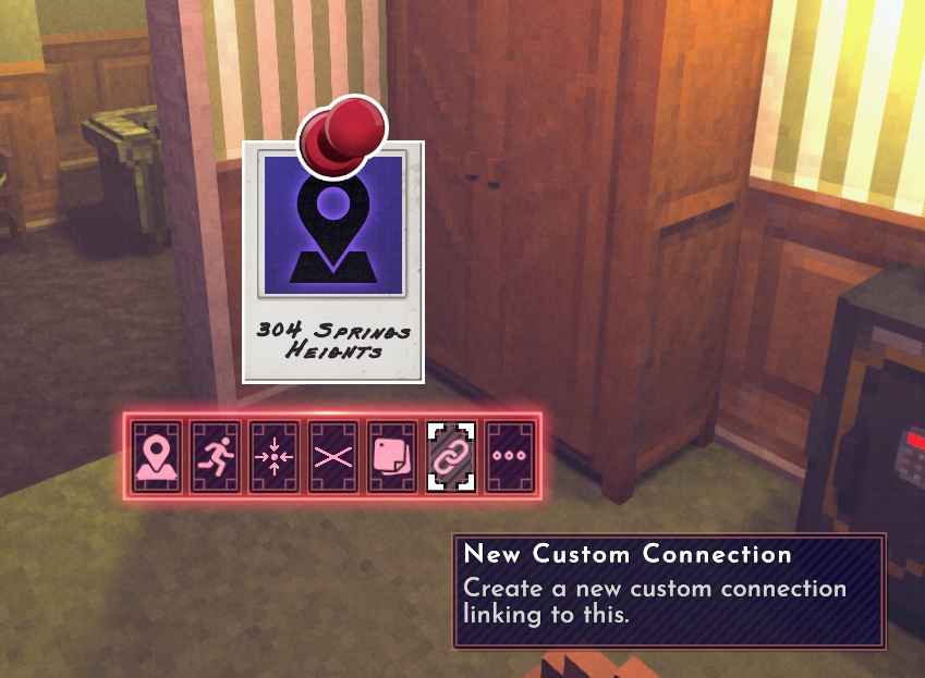 点击此按钮会生成一条红色连线,它将跟随鼠标移动。你也可以使用鼠标中键(按下滚轮)并按住来实现相同操作,该功能可在选项菜单中重新绑定键位。现在,让我们在这份证据、公寓以及它那位帅到邪门的房东之间建立一条自定义连线吧。