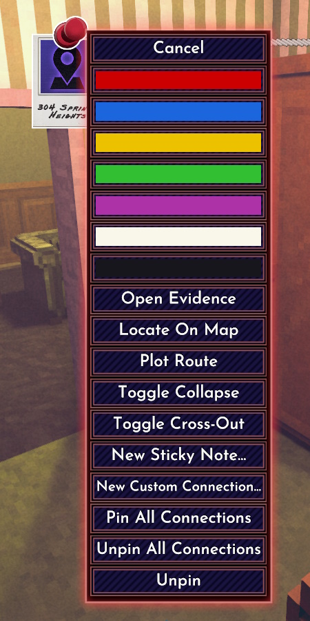 首先,将鼠标悬停在证物图钉上。稍等片刻,下方会出现一个菜单。