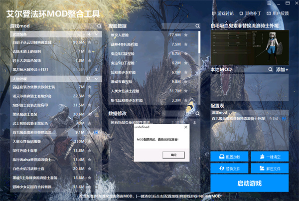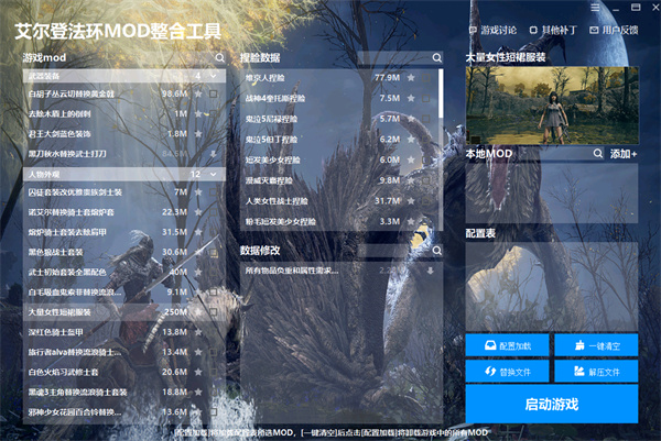 这时候有个大佬开发了个超级方便的mod整合工具——艾尔登法环mod整合工具,绝对是你刷游戏的最佳拍档!这个工具不仅省去了你到处找mod的时间,还直接把所有热门mod都打包好了。最棒的是它能一键安装、配置、卸载mod,完全不用手动找文件夹什么的,省事多了。