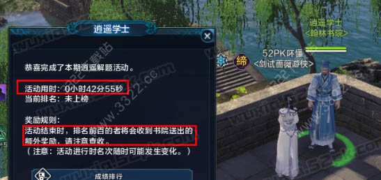 3、其中答完15位逍遥学士的题目之后会统计玩家的总共用时(逍遥答题的题目与普通书院研学不同,每位学士的题目只有15秒时间作答,玩家答错或者未作答都会增加30秒的用时时间,看来学霸终于有用武之地了)。用时在前100名的童鞋会获得更为丰厚的排名奖励。【点击查看】》52PK天涯明月刀逍遥答题器(题库整合完善中)