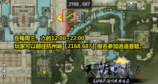 在每周三、周六12:00-22:00,玩家可以在杭州城【2168,687】逍遥学士报名参加逍遥答题。