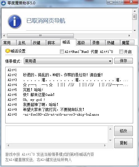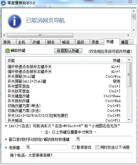 零度魔兽助手5.0是一款简单易用的魔兽争霸辅助工具,支持一键创建局域网游戏房间、一键改变游戏中的按键、一键使用多种脚本、一键自动喊话等多种强大的辅助,可让用户更加有趣的进行游戏过程。同时零度魔兽助手5.0还支持多种模式的窗口化设置,并且可以记忆您的窗口化设置,以便在下次启动魔兽时自动为您窗口化,可以选择屏蔽Win、Alt+TAB、Alt+Q、Alt+S、Alt+A、PrintScreen等烦人键,支持屏蔽小地图区右击操作,防止被追杀时不小心点错回头被杀的郁闷,支持键盘和鼠标改键,支持一键改多键、多键改多键、支持AI智能改键,喊话支持一键发送多行内容等等功能。有需要的玩家可以下载体验!