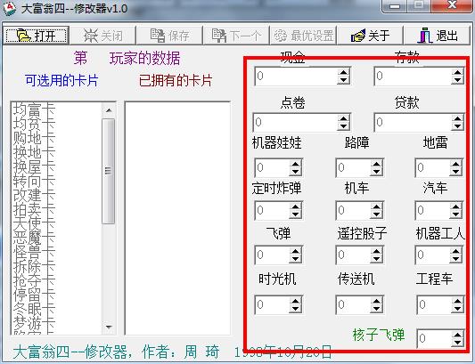 大富翁4修改器专业应用于大富翁4的辅助工具,支持修改现金、存款、点券和贷款的金额,并可自定义机器娃娃、路障、地雷、定时炸弹、机车、汽车、飞弹、遥控股子、机器工人、时光机、传送机和工程车等属性,可以说大富翁4修改器的存在绝对可让玩家更好的进行游戏的玩乐。大富翁4是由大宇资讯开发的一款多人联机模拟经营类游戏,于2000年发行。本作采用了640×480分辨率、HI-COLOR(65536色)高解析度、高彩显示模式。玩家可控制不同的人物,通过房地产、股票等多种商业形式赚取资金,并使用特殊的卡片和道具获得更多利益。大富翁4为了兼顾游戏运行的流畅与画面精致,《大富翁4》甚至把以往的3D即时贴图以顺序性3D图像代替,使玩家感到耳目一新。此外,行走路线设计摒弃了原来中规中矩的四方型,改为45度俯角视窗,通过八组可转动的镜头视角,可以一览丰富多彩的画面。与以往的《大富翁》不同,在第四代中有一个创新的做法:众位玩家可以在游戏开始时,自行设定不同的规则,伴随着不同的规则,会面临不同的挑战。由于完全开放的操作设定大大提高了游戏的弹性,尤其是在多人联线时,可以根据玩家的喜好,变化出多种不同的玩法,更有一番不同的乐趣。另外,大富翁4的场景横跨中国台湾、中国大陆、日本、美国四地,各式各样的绚丽风景和特殊事件层出不穷,令人目不暇接。就游戏内容而言,《大富翁4》仍旧以土地建设和房地产经营为核心,但与前三代相比则更复杂多样,更需头脑;投资方面则有股市交易、房地产炒作、企业股东分红等不同手段;更有30张功能独特的策略卡片,附之以特殊道具、各式买卖等等。