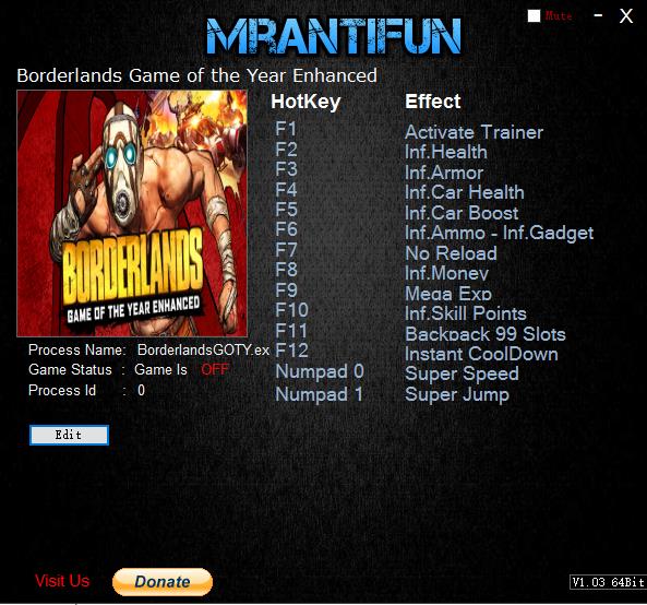 无主之地年度版上线就非常火爆,该作一改原先传统3D渲染,转投美术渲染风格,游戏提供了大量的关卡供玩家游玩,如果你对官方设定的关卡想要修改的话,还可以自定义任务。无主之地年度版十三项修改器是为无主之地游戏所打造的辅助工具,该修改器支持十三项修改属性,可以实现以下功能,包括无限生命、无限护甲、无限车辆生命、无限弹药、无限汽车加速、无限金钱、技能立刻冷却等,让你轻松刷刷刷,重温高清经典。可以自定义的内容包括了任务目标,武器配置,敌人数量,掉落物品种类,几乎所有游戏中出现的要素都可以按照自己的喜好进行修改。但是要注意的是,开启一些功能,会严重破坏游戏的平衡,失去游戏乐趣,请慎重选择需要使用的功能,这样不仅可以帮助你更容易的进行游戏,还能继续享受游戏给你带来的刺激。