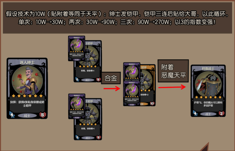 变体:这里要谈到上面为什么会留持盾战士了,我们可以通过落地战士附着的打法来优化“高举利刃对着、高举利刃附着,贴给持盾战士”,六本有迷人绅士,还是比较好凑的,这样子减少恶魔天平消耗数量