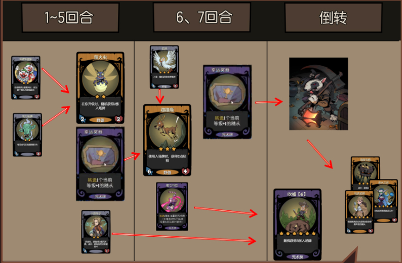 ①1到5回合:停在二本增加萤火虫数量(至少4只白的,越多越好),小提琴手在3回合有就拿(如果有办法拿到成长咒术可以打给他尝试看6本,法力图腾在5回合前都可以拿(有1个金的就行了多了有点卡格子),窃贼只抓左边刷的入场及经济牌。