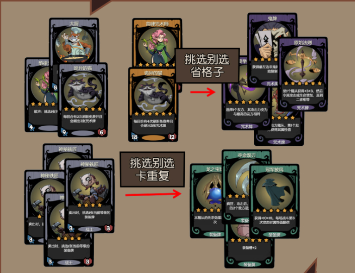 细节:挑选的咒术牌(韵律师、大厨)没有成长就不要选,挂着别占手牌位;路上的四本铁匠,见到就拿,但是卖了之后装备不要选(怀表除外),这样能够卡出很多重复的装备(疯狂、背包、翻倍斗篷等等)