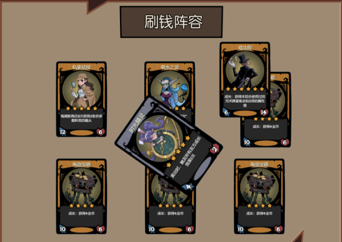 思路:我们启动,最好是两个金侦探,这样他能给我们发多些钱箱、精灵、以及触发成长的咒术:在我们做了4个金钱箱之后,可以只保留一个侦探,把钱箱全扔下去,以及一个戏法师扔下去吃成长,大概做到1500+金币就可以了。