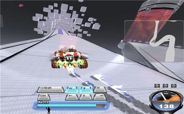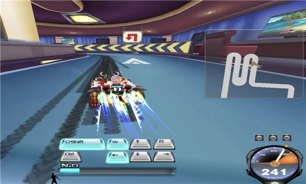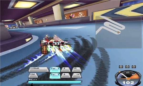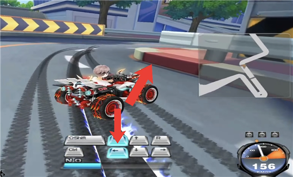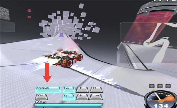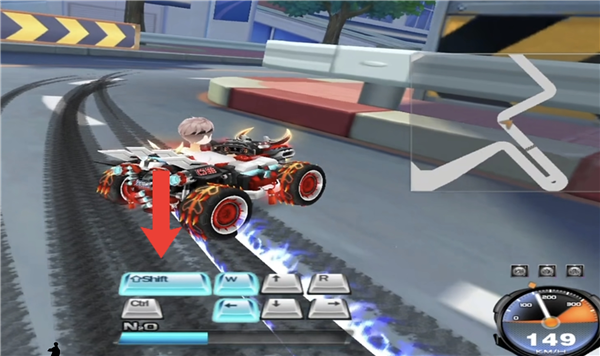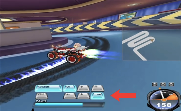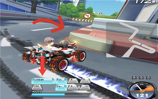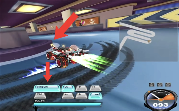 3.放开油门↑,只按下→+Shift两个键,进行第二次飘移(注:这步比较关键!如果按下油门↑的话就会导致过早的进行喷火!)