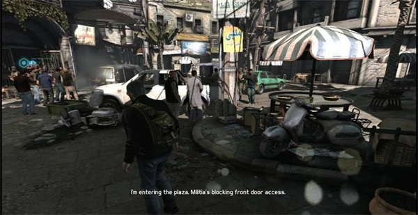 1、穿着便装的费舍尔穿过了班加西的一处市集,来到了小广场上,但是通往安全屋的道路被武装组织所封锁了,那么费舍尔就之后走进左侧褐色大门的后巷。