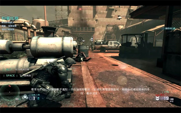 5、然后打开右侧小楼梯上的椚(同样在椚的一侧先take cover观察情况),发现屋内有三名男子呆在厨房内(其中一人虽然是坐在椅子上,但并非被绑架,同为武装人员),进入屋内不遇他们相接触,依靠着挡板从他们的右侧走廊绕到他们后方的楼梯前(不要多手打开厨房后门!)
