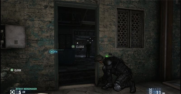 6、、来到二楼后,费舍尔可以在楼道前按A键关闭走廊上的电灯(此时如果打开一楼厨房后门,就会有敌人探寻上来),在走廊右侧的第一间房间会有一名敌人,所以要注意。尾随他,当其转身后将其割喉(这里有把风扇的影子挺吓人的)。