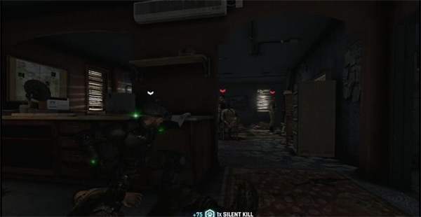 8、在厕所外会有一名武装人员,费沙弄出一些骚动后,他就会冲进来查看倒卧在马桶前的伙伴,上前也给他一记割喉了事,在厕所左侧的卧室内也有一名武装人员,这人比较机警但卧室非必经之路,我们可以无视他。