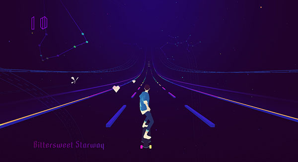 5、游戏的每一关都有一首专属的歌曲,关卡长度与歌曲时长一致,事实上,整个关卡的氛围营造都是围绕这首特定的歌曲展开的,这些曲子正是《再见狂野之心》核心内容的重要构成。Simogo 从 Betty Who、CHVRCHES、Taylor Swift 等音乐人的作品中吸取灵感,创作出了很多首动听的合成器流行(Synth Pop)风格的曲目;它们大都具有快节奏且爽快感突出的旋律,与画面中的色彩、特效、意象、表演等元素默契搭配,再与玩家手上的操作相结合,全方位地“入侵”到玩家的感官当中,构成了一种定位与 MV 类似、可互动性和参与感却又远超 MV 的复合体验。