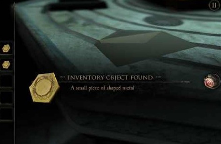 2、之后还要按照指示用目镜看盒盖,按一下红色指纹的地方就得到一块六角形金属片。我很想说徽章,不过原文翻译也只是块金属片。