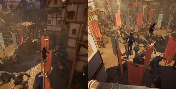 24、下方巨魔举着旗帜,你们跳到旗帜上方的圆形平台上,要注意巨魔是随时移动的。