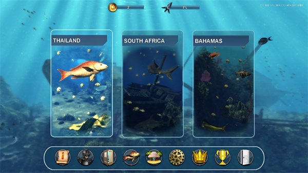 三个地点包括:泰国、南非和巴哈马等地区,环境由珊瑚、沉船、岩石构成,富有海底氛围。任务类型多样,包括捕猎特定鱼类、搜索宝藏或拍摄难以捕捉的目标。