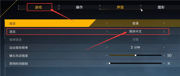 2.进入选项页面后,点击该界面上方的游戏设置,再在下方找到语言设置,最后将语言设置后面的语言更改为简体中文即可。