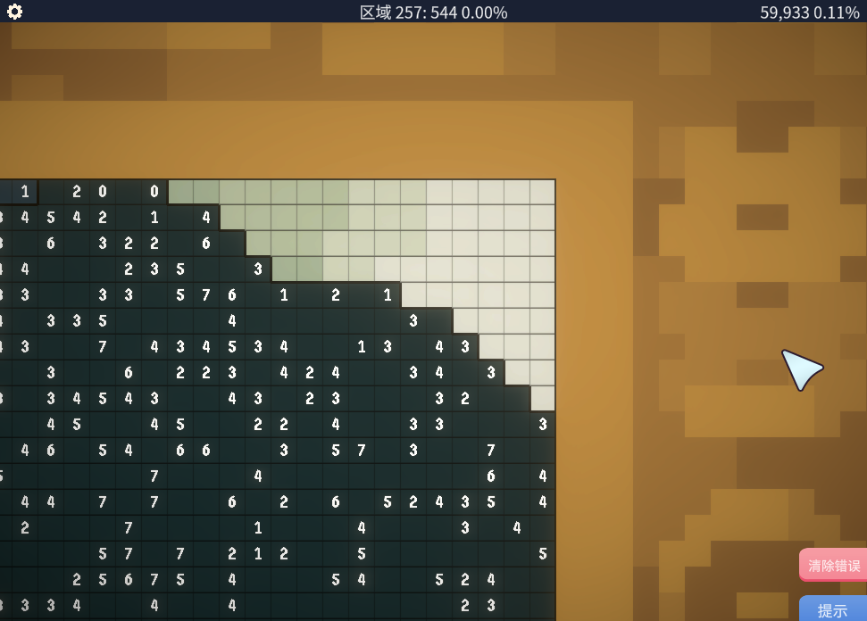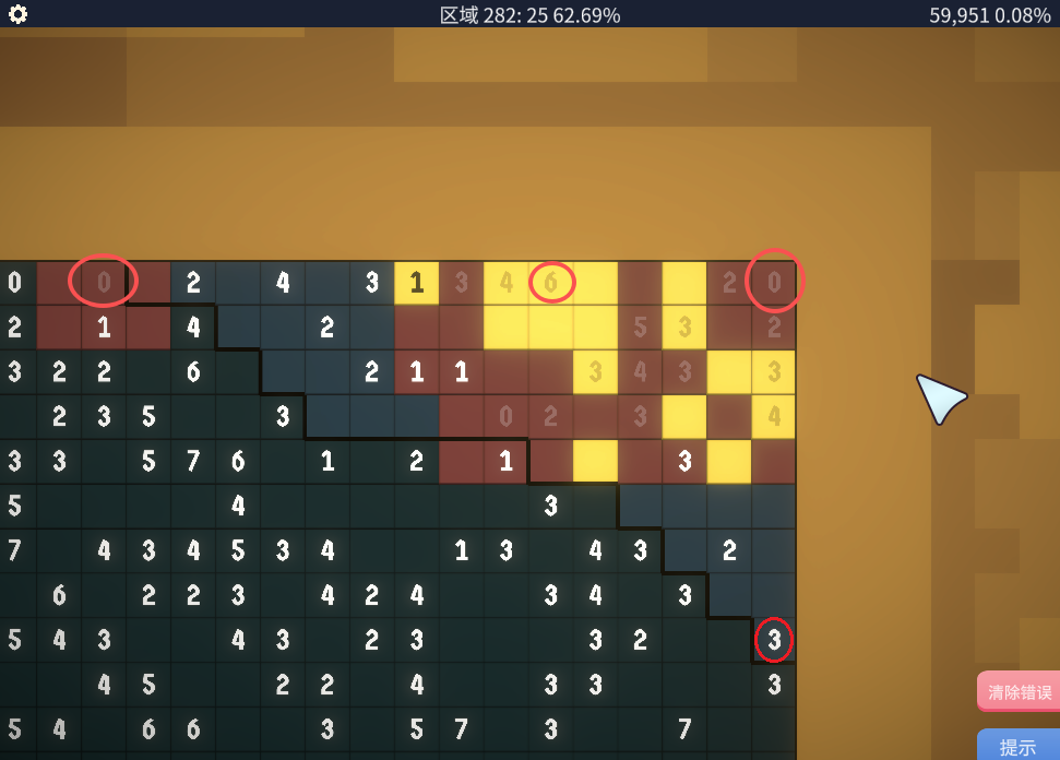 4、游戏中的每个数字代表周围格子包括数字本身格子一共九个格子的亮色数量(鼠标左键标记),其余皆标记为暗色(鼠标右键标记),其余及需要找到关键数字,比如“0”,“9”,还有边缘处的“6”等等。