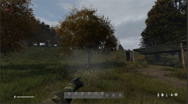 1、游戏开局补充食物的方式,如图所示这种树木就是苹果树,走过去在树冠下仔细找一找有一定几率可以找到落地的水果,比如苹果或者梨之类的,如果运气好你可以捡到几个水果。