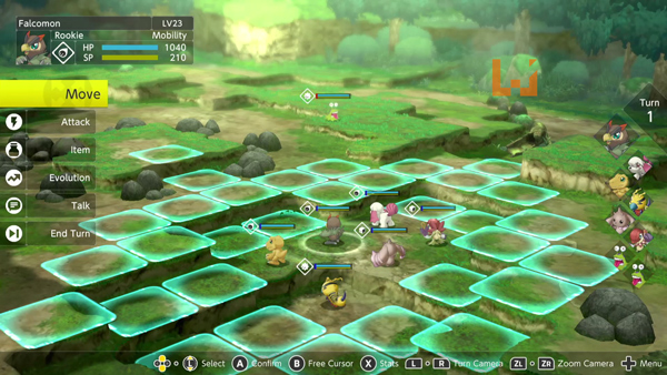 游戏中有超过100只数码兽,每个都有独特的进化路线。战斗系统基于简单的SRPG机制,地图棋盘式设计,地形高低差和面向影响战斗策略。虽然基础属性相互克制,但玩法略显单调,缺乏深度策略性。自由行动模式让玩家探索世界,与数码兽互动,选择是否加入队伍。