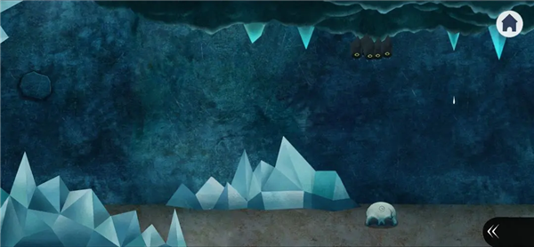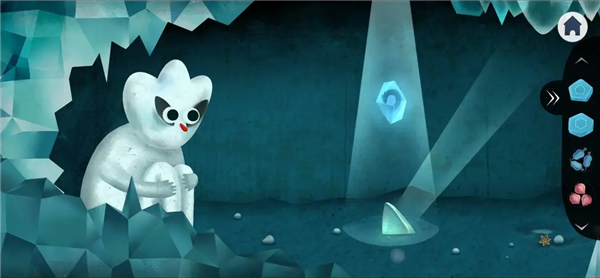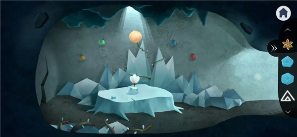 10、点击黄色花苞上方光洞里的冰棱,怪物吓醒离开,左侧冰块掉落,点击图上的四只萤火虫,并按照壁画顺序把颜色调整成黄绿蓝红。