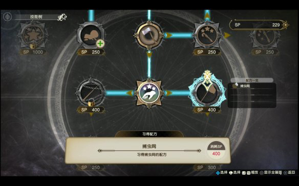 相比战斗,炼金术方面的改动不是很大。和前作相同只要放入所需素材即可调和出自己想要的道具、素材或武器,玩过前作的玩家只要熟悉一下即可轻松上手。不同的是本作取消了炼金等级,直接将炼金配方加入了技能树中,像是采集素材需要用到镰刀、斧子等配方都需要在技能树中解锁。