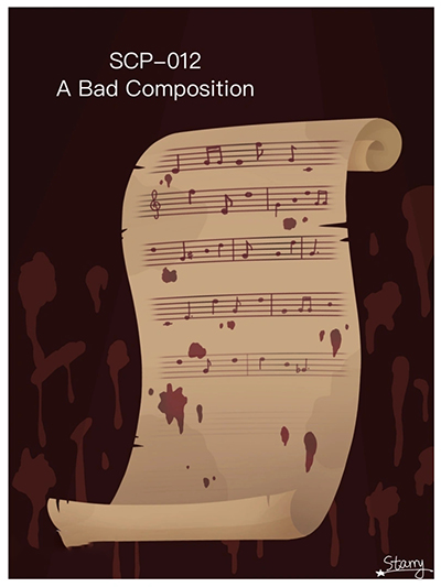 描述:SCP-012在一次针对一座近期被风暴摧毁的北部古墓的发掘中由K·M·桑多瓦尔回收。该物系一套完整乐曲的一部片段手稿,片段名为“在各各他山上”,而该片段似乎尚未完成。手稿使用的红/黑色墨水最初被认为是某种浆果或其他天然染料,但之后被发现是人类血液,且来自多个供源。最早发现SCP-012的人员有两名成员陷入疯狂,他们试图用自己的血完成乐章,这最终导致了大量失血和内伤。