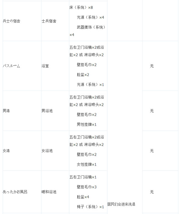 7、乡村山庄:床铺8、照明4、农具装饰4、柴薪4。