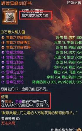 ③ 不同品质的刻印书激活血石属性、属性值都不同,同一种刻印书激活的血石属性在几个选项内随机。在应用刻印书时,不同品质的刻印书想洗出最大值,都有最低的潜力值要求,即血石两端装备的潜力值和不能小于该值。