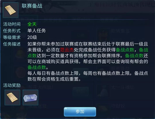如果你加入了帮派,还可以参加帮派里的行酒令、帮派大盗、联赛备战任务。行酒令和帮派大盗时间大概在晚7点左右,联赛备战全天可接。另外在这个等级,也可以找侠侣结婚了哦。