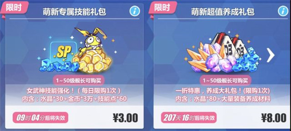 ★1-50级的舰长,可以在商店中购买【萌新专属技能礼包】(每日可购买一次),【萌新超值养成礼包】,能加速对女武神技能及装备的培养哦~