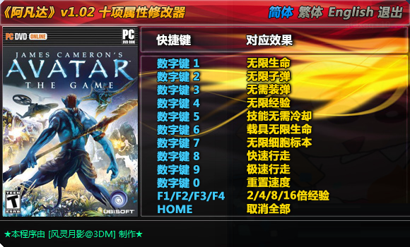 阿凡达游戏修改器,在这里玩家可以修改阿凡达游戏中的各种功能,例如无限生命、无限子弹、快速行走等等功能,玩家可以在这里体验无敌般的感觉,生命无限、子弹无限玩游戏就需要那么畅快淋漓哦,就需要那么爽,修改器本身还支持简体、繁体和英语三种语言哦........