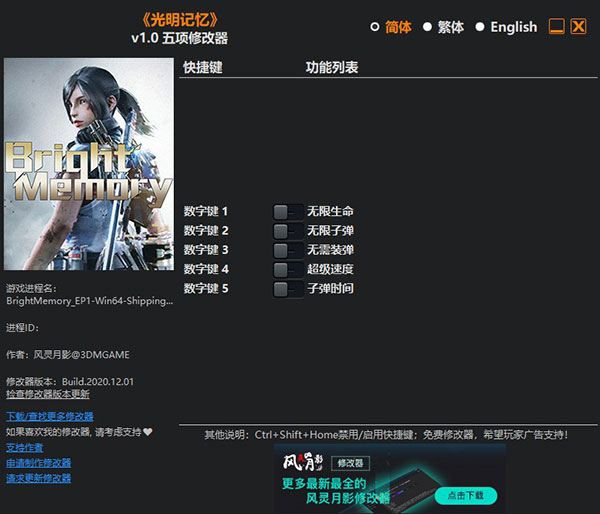 光明记忆修改器是由风灵月影针对同名游戏所推出的一个游戏辅助工具,通过它可以轻松的帮助玩家增强游戏体验,提供了无限生命、无限子弹、无需装弹、超级速度、子弹时间等五项强大的游戏修改功能,不论是玩家在战斗射击中角色子弹匮乏,还是太过容易死亡,有了这款修改器的帮助,都可以让玩家享受机制的游戏乐趣。不仅如此,修改器中支持简体、繁体、英文等多种语言设置,界面简洁清爽,使用也极其简单,玩家只需进入游戏后打开修改器,根据自身的需求设置所需的按键即可,从而更加轻松的完成游戏中的各种任务剧情,享受紧张刺激的射击挑战,感兴趣的小伙伴快来下载吧。