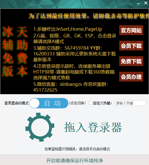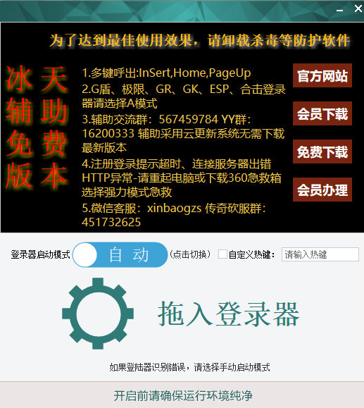 冰天辅助免费版是一款专门应用于传奇游戏的辅助工具,基本上支持所有的传奇类型游戏,具有加速功能,完全免费,不受IP的限制.....诸多特点,傻瓜式的操作,十分简单,不要学就会,而且页面也十分简洁,没有什么广告,是一个很不错的传奇辅助工具,用户只要有了它,无论用户在那里,只要有了电脑什么时候都能用哦,而且用户只需一键就能完全的智能化控制哦,用户无需待在电脑面前,它会一键帮你搞定......冰天辅助免费版采用智能过检测,全面支持市面上所有的登陆器(秒杀刀锋、GAMEM2、非凡、DEE凤天、无双、猎鹰、金盾、M6、巨牛、3KM2.飞翔、LEGEND-CD等主流登陆器版本)并独家采用云端技术更新,用户无需重复下载,自动更新