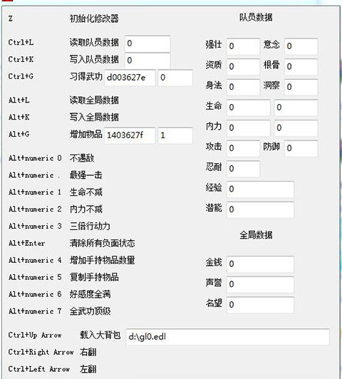 2. ctrl+L: 读取队员数据\ctrl+K: 写入队员数据\ctrl+G: 习得武功
