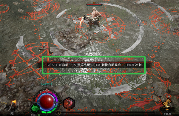 3、游戏以WASD键进行移动,Q键开关火炬,TAB键切换自动瞄准,而空格键则进行冲刺。
