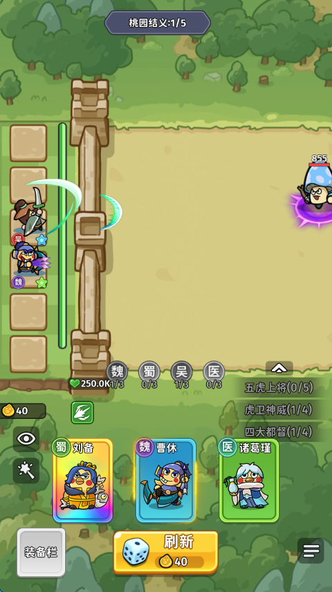 乱弹三国志官方正版是一款以三国为背景的放置塔防策略手游,玩家将收集诸多三国武将,组建自己的策略卡组,武将分为魏、蜀、吴及特殊“医”四大阵容,每个阵容以曹操、刘备、孙权、华佗为核心,你必须配备对应核心才能激活阵容的特色羁绊。乱弹三国志手游内玩家可通过搭配同阵营武将,你还可触发诸如“五虎上将”“虎卫神威”“四大都督”等羁绊组合,获得显著的属性加成,从而极大提升队伍实力与对战胜算!感兴趣的玩家欢迎下载体验。