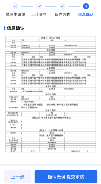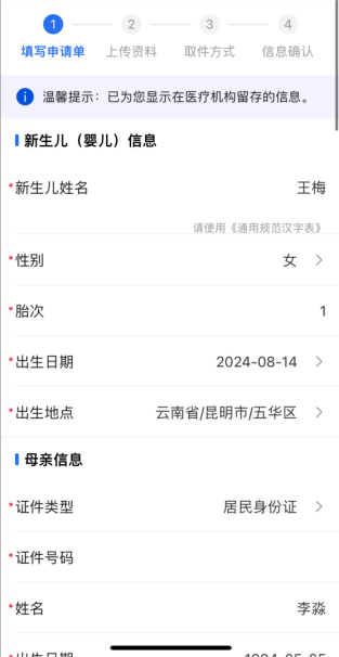 5、根据真实情况填写申请表,其中新生儿母亲信息自动抓取“云南省妇幼健康信息平台”中的分娩信息,需由申请人(新生儿母亲)仔细核对。