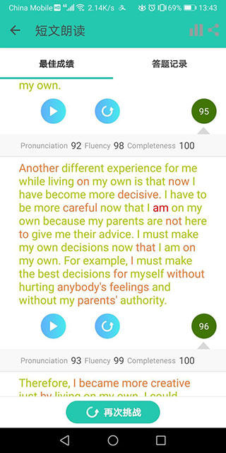 我觉得这个App挺适合学生用的,特别是那些想提高口语但时间不多的同学。你可以随时随地学,比如排队的时候就能搞定一个知识点。不过,要想得高分,还是要靠自己努力,声音要大,发音要清晰,语速要均匀。对了,AI评分能帮助你发现发音问题,挺有用的。