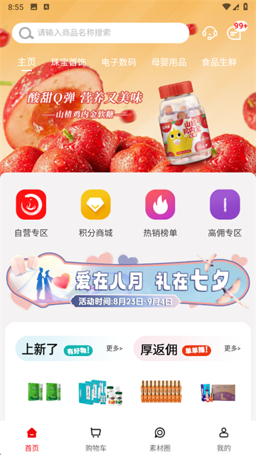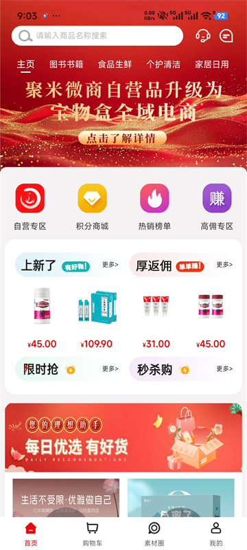 用起来也挺方便,打开App首页就能看到各种促销专区和分类导航,选好东西直接加入购物车或者下单就行了。订单流程简单明了,填个地址就搞定了。对了,他们还有一个素材圈,可以看推荐好物,还能复制文案分享种草,感觉挺贴心的。
