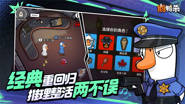 游戏中的角色分为三类:鹅阵营有侦探、观鸟者、保镖等辅助角色;鸭子阵营有刺客、杀手、静音等破坏者;中立角色如鸽子需要感染所有玩家才能获胜。地图和化妆品也是游戏的一大亮点,玩家可以自定义角色的外观。