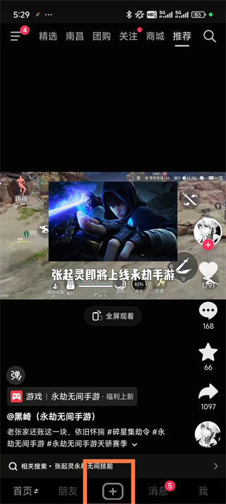 1、运行抖音,点击首页中的“+”标志,进入视频录制界面;