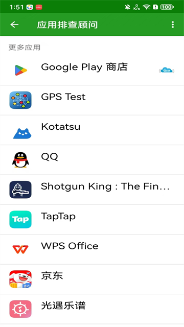 4、点击右下角绿色加号,进入“应用排查顾问”界面。“绿色守护”会将这些应用分为四类:后台运行中;可能减缓设备相应速度;最近运行过;更多应用。你只要从中多选那些频繁在后台唤醒手机的服务(主要集中在前两类应用分组中;第3类应用分组中那些你最近没有运行过的App也很可疑),然后点击右上角的"✓",这些应用将被"绿色化",再也不会自动后台重启,除非用户主动使用这些应用。