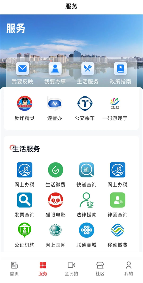遂宁各大企事业单位的掌上服务窗口,强大的生活服务工具:查社保、查医保、查公积金、查违章、水电气费查缴、手机银行、出行路况、景区景点实时画面、订餐、订票……提供各类会员卡、社区活动资讯