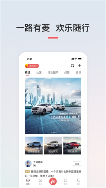 广汽三菱app是广汽三菱用户交流的官方平台,始终坚持以客户为中心,关注用户的核心诉求,致力于持续打造独特的品牌印记,与用户建立更深的情感共鸣,通过创新营销模式和越级产品实力,为大家带来更具乐趣的高价值用车生活。在这里,我们每一位用户都可以与志同道合的菱友们一起获取新鲜的广汽三菱新闻资讯,参与官方/销售店举办的互动活动、用积分兑换各类文创潮品、分享用车心得及生活感悟等。贴心的服务功能、便捷的浏览方式、潮流的话题动态以及丰富的资讯内容,只为给你提供更加美好的用车生活,与你共享驾驭探索之趣。此外有想要购买该系列车辆的用户也可以通过广汽三菱app预约试驾和订车哦,并且在这里上面还可以查看有关它的各种优惠活动,节省我们线下的时间。