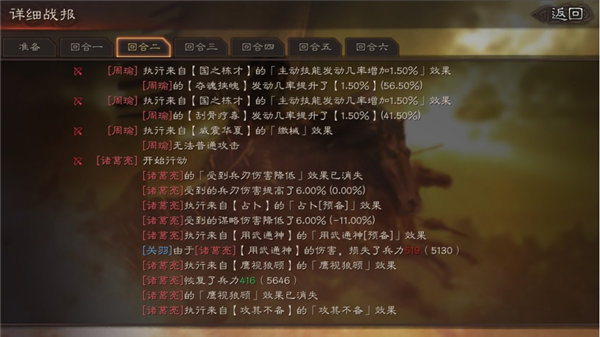 来到第三回合,司马懿连续三回合使用战法智计降低敌方武力输出,然后发动战法落雷攻击了敌方被智计削弱了智力的关羽,在攻击敌人同时为自身恢复了不少伤兵。随后,张飞和关羽不再有之前的好运气,张飞没有发动战法,关羽再次被诸葛亮的神机妙算打断了战法横扫千军,赵云也只是普通攻击,借此机会,周瑜使用神火计,配合鹰视狼顾恢复了496兵力,使用刮骨疗毒恢复了自身1776兵力,兵力恢复到5000+,而敌方此时关羽只剩下两千余人。后面普攻也攻击到关羽,关羽兵力告急。